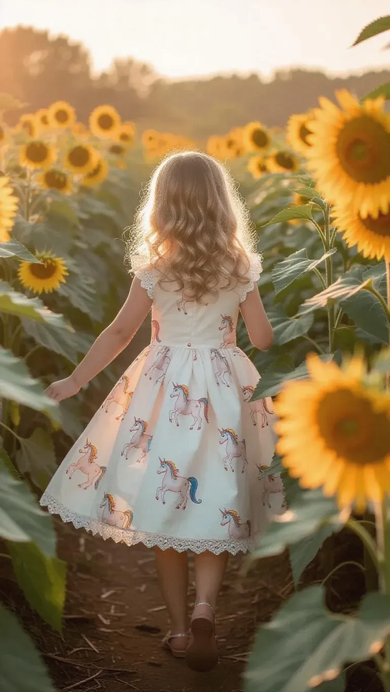 A little girl wearing a vintage style dress with whimsical unicorns, prances through a sunflower maze, the light breeze carrying floral scents, contributing to the magical atmosphere.