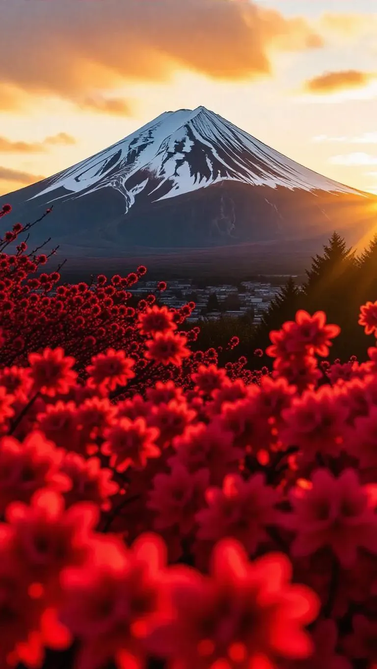 An artistic close-up of Mount Fuji, its snow-capped peak turned into a lush carpet of deep red blossoms. The iconic mountain shape remains, but the summit is now a bold, floral haven. Radiant morning sunlight gently illuminates the petals, casting a rich, vibrant glow. The atmosphere is intense and passionate, with golden skies enhancing the dynamic, symbolic blend of nature and vitality.