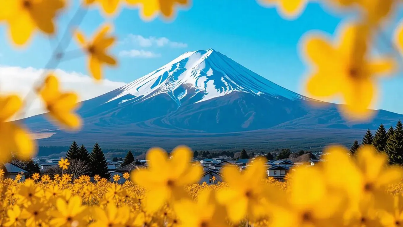 An artistic close-up of Mount Fuji, its snow-capped peak transformed into a sparkling sea of golden flowers. The iconic mountain shape remains, but the summit is now a dazzling, floral haven. Bright afternoon sunlight illuminates the petals, casting a cheerful, shimmering glow. The atmosphere is joyful and exuberant, with blue skies enhancing the vibrant, symbolic blend of nature and happiness.