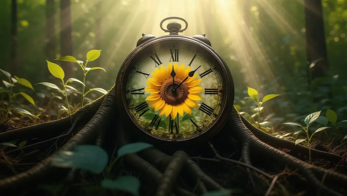 A worn clock nestled in the deep woods, its markings glowing subtly, displaying vivid yellow sunflowers, surrounded by grass-covered roots and soft shadows filtering through the canopy.