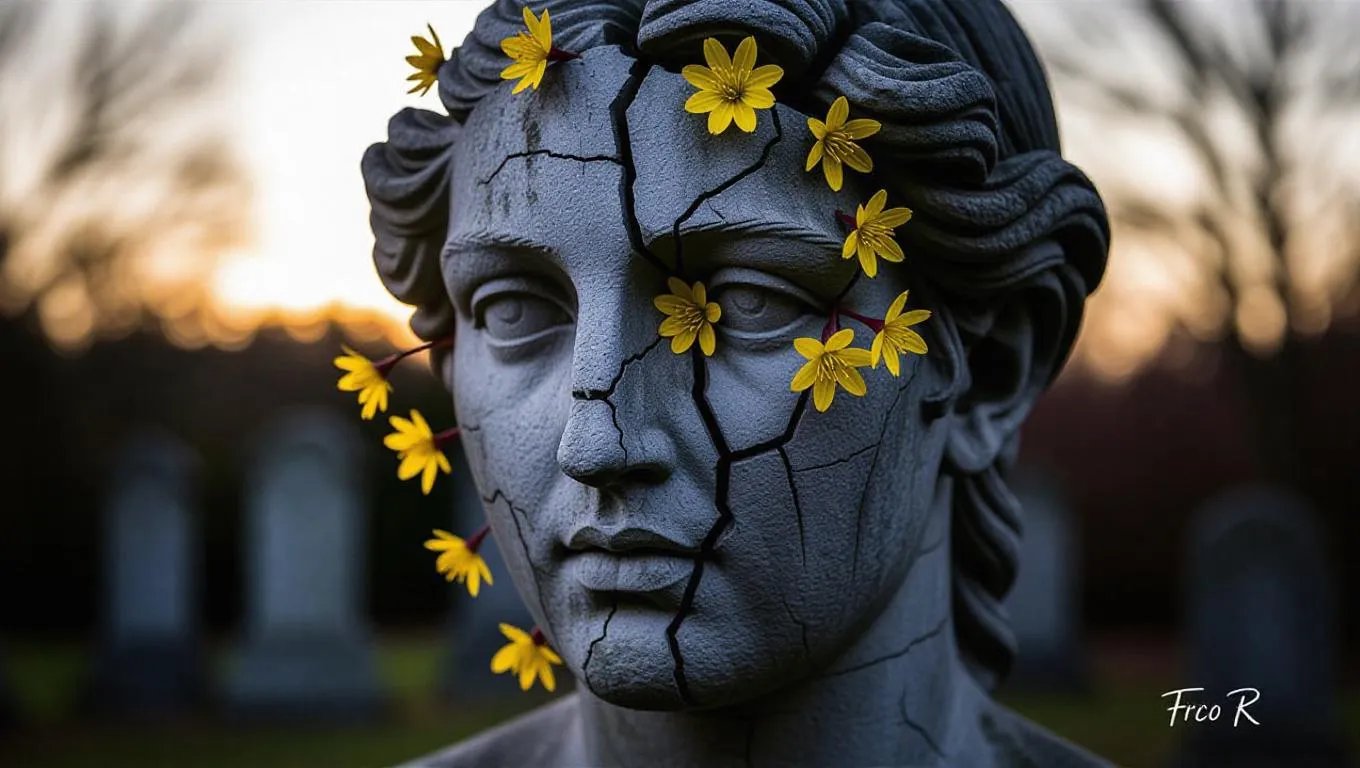 A weathered and broken stone sculpture of a human face, its surface cracked and fragmented, exuding a sense of decay and history. Emerging from the crevices and gaps are delicate yellow blossoms, their vibrant petals contrasting sharply with the cold, gray stone. The flowers symbolize resilience and renewal, creating a striking juxtaposition between the brokenness of the sculpture and the beauty of new life. The background is softly blurred, with hints of twilight light illuminating the scene, enhancing the emotional depth and visual impact. The atmosphere is both melancholic and hopeful, capturing the duality of destruction and rebirth. The art style is highly detailed and evocative, emphasizing the textures of the stone, the fragility of the flowers, and the interplay of light and shadow.