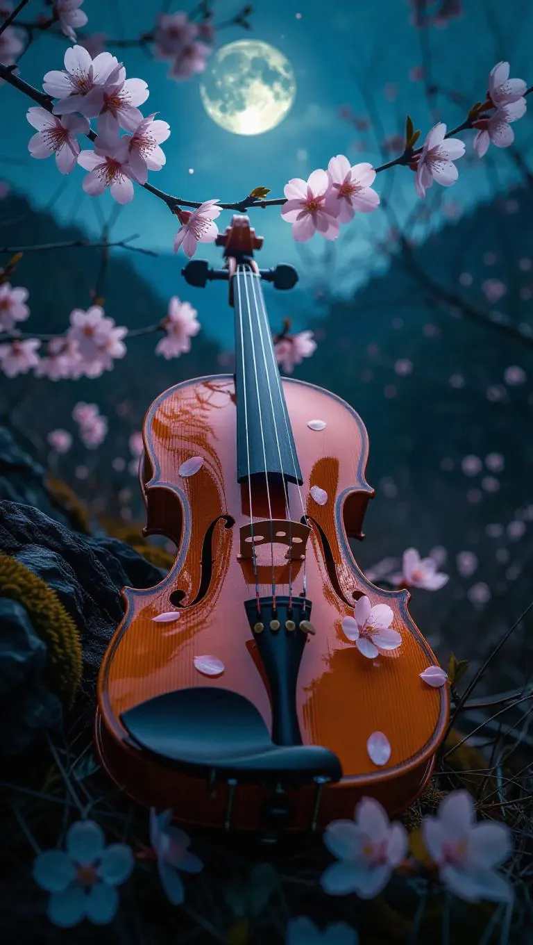 A weathered violin lying in a moonlit mountain clearing, its wooden body cracked open, with delicate cherry blossoms sprouting from within, petals gently fluttering in the breeze, creating a surreal and enchanting scene.