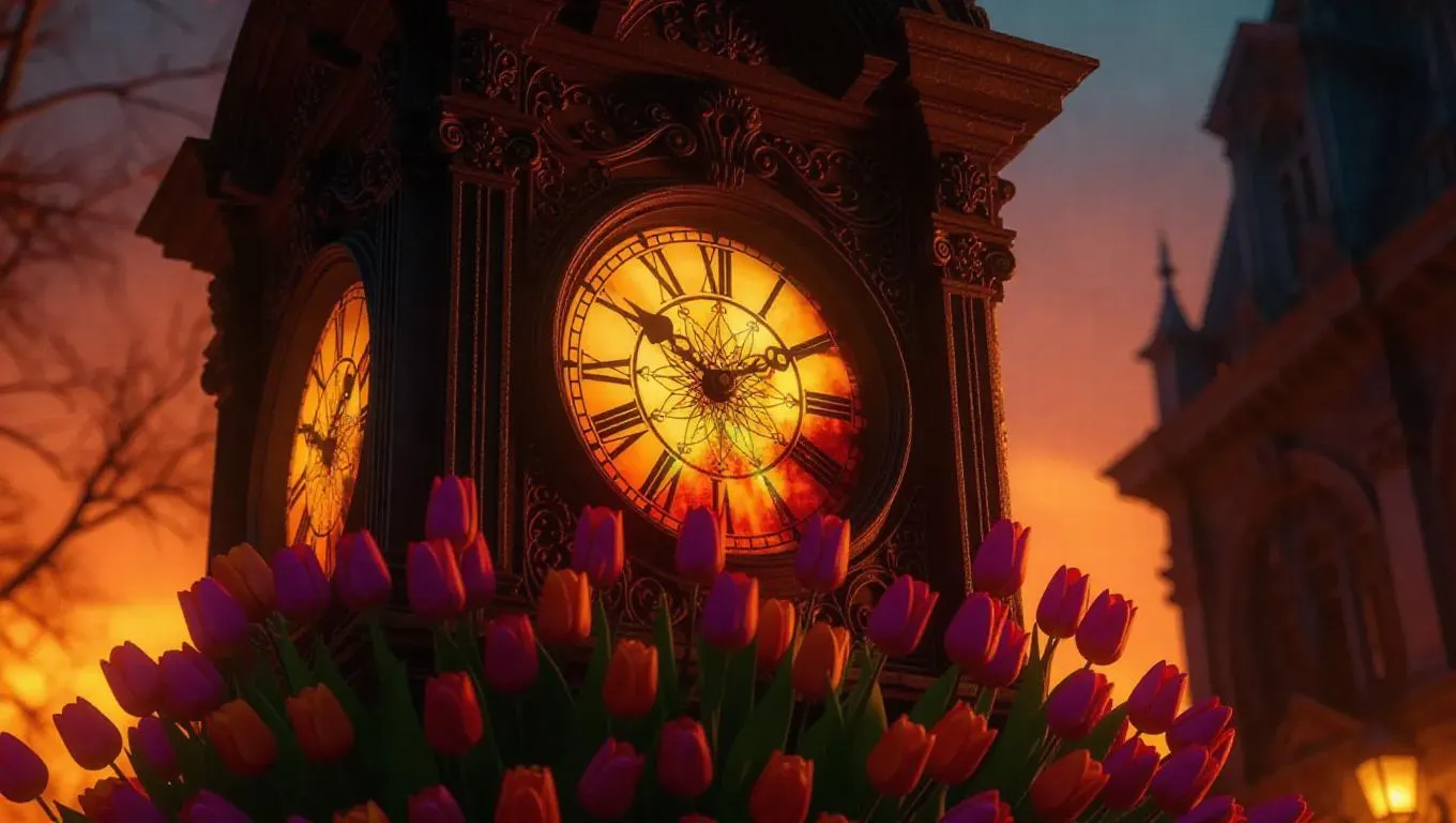 An ornate, dilapidated clock tower, shining with a warm, amber glow from its damaged face, entwined with colorful tulips that adorn its walls and burst from its edges, creating a vibrant, fairy-tale atmosphere.