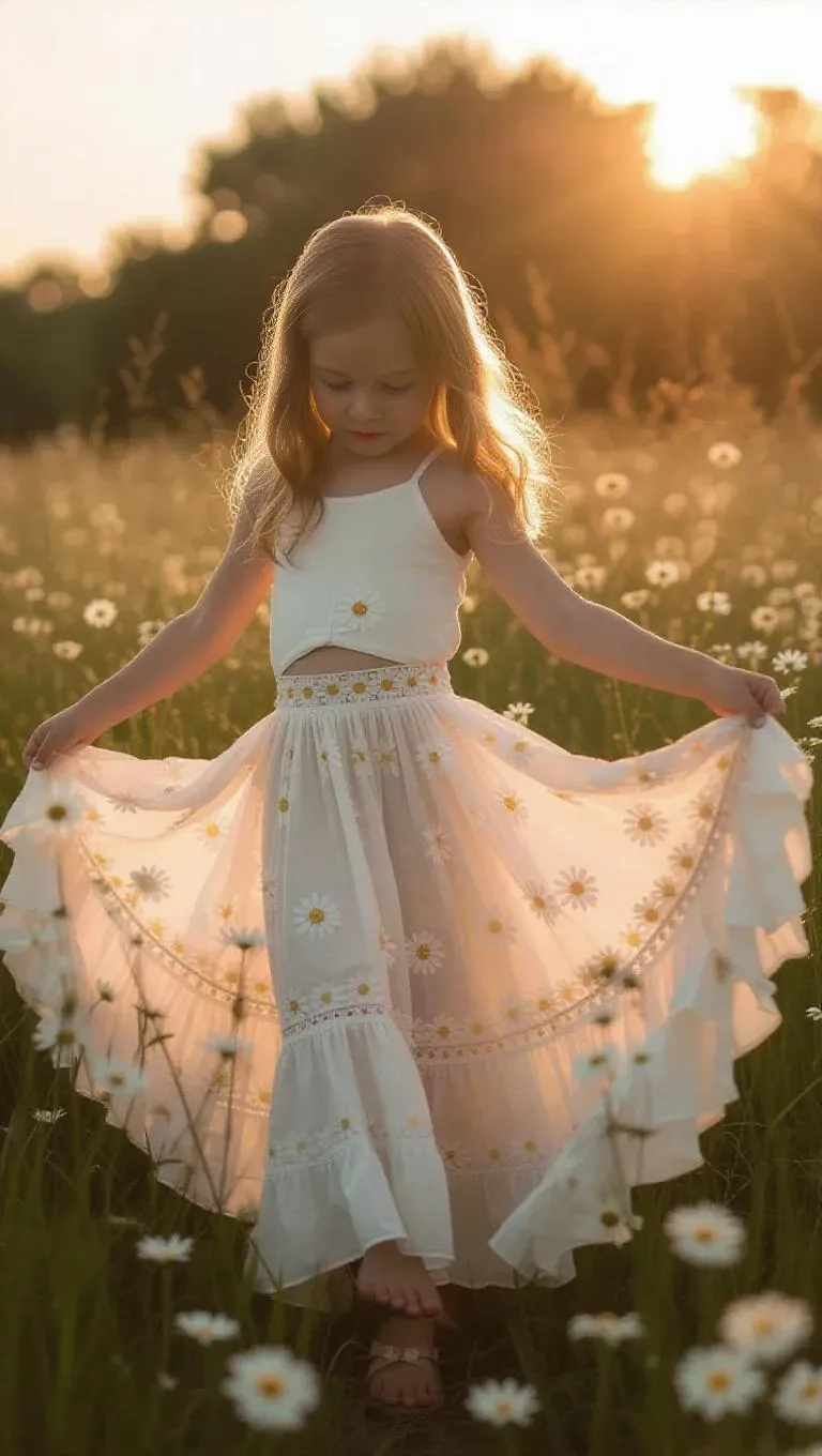 A child wearing a bohemian maxi skirt with delicate daisies blooming along the waistband and flowing fabric, creating a whimsical blend of free-spirited style and natural beauty. She twirls in a meadow, the soft breeze carrying the scent of wildflowers, enhancing the serene and magical atmosphere.
