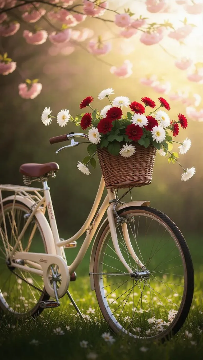 A vintage-style bicycle adorned with red and white blossoms that seem to be gently touched by the breath of spring. The bike’s frame is elegantly designed, with a wicker basket at the front filled with fresh, vibrant flowers in shades of red, white, and yellow. The wheels gleam in the soft sunlight, reflecting the surrounding beauty. The blossoms cascade gracefully from the handlebars and frame, creating a romantic and dreamy atmosphere. The scene is set against a soft, blurred background of lush greenery, enhancing the focus on the bicycle and its floral adornments. The entire composition exudes warmth and nostalgia, as if the bicycle is carrying a load of springtime magic to a distant, idyllic destination. The art style is highly detailed and whimsical, capturing the textures of the flowers, the glossy sheen of the bike, and the enchanting essence of the moment.