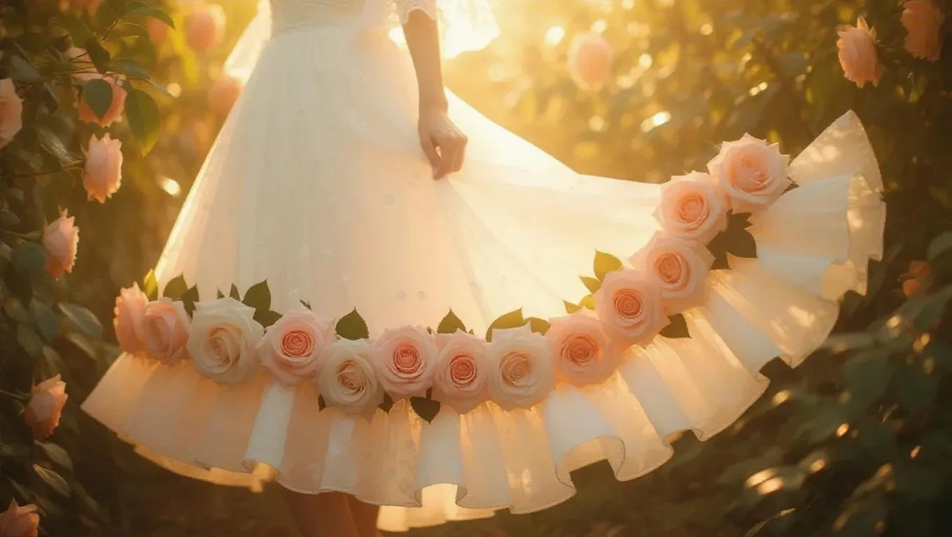 A flowing white dress with delicate coral roses blossoming along the hem and sleeves, creating a whimsical blend of elegance and natural beauty. The dress sways gently in the breeze, surrounded by soft, pastel sunlight filtering through leaves, enhancing the serene and magical atmosphere.
