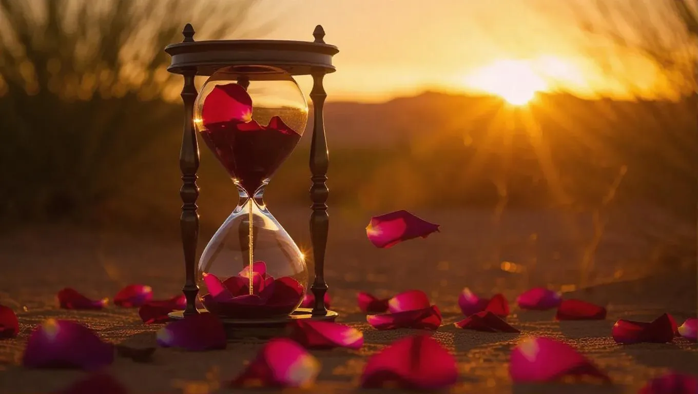 An antique hourglass, its glass shattered, with vibrant rose petals floating out, time suspended in eternal bloom, surrounded by a warm, golden glow, capturing the moment of timeless beauty and fragility in a serene desert.