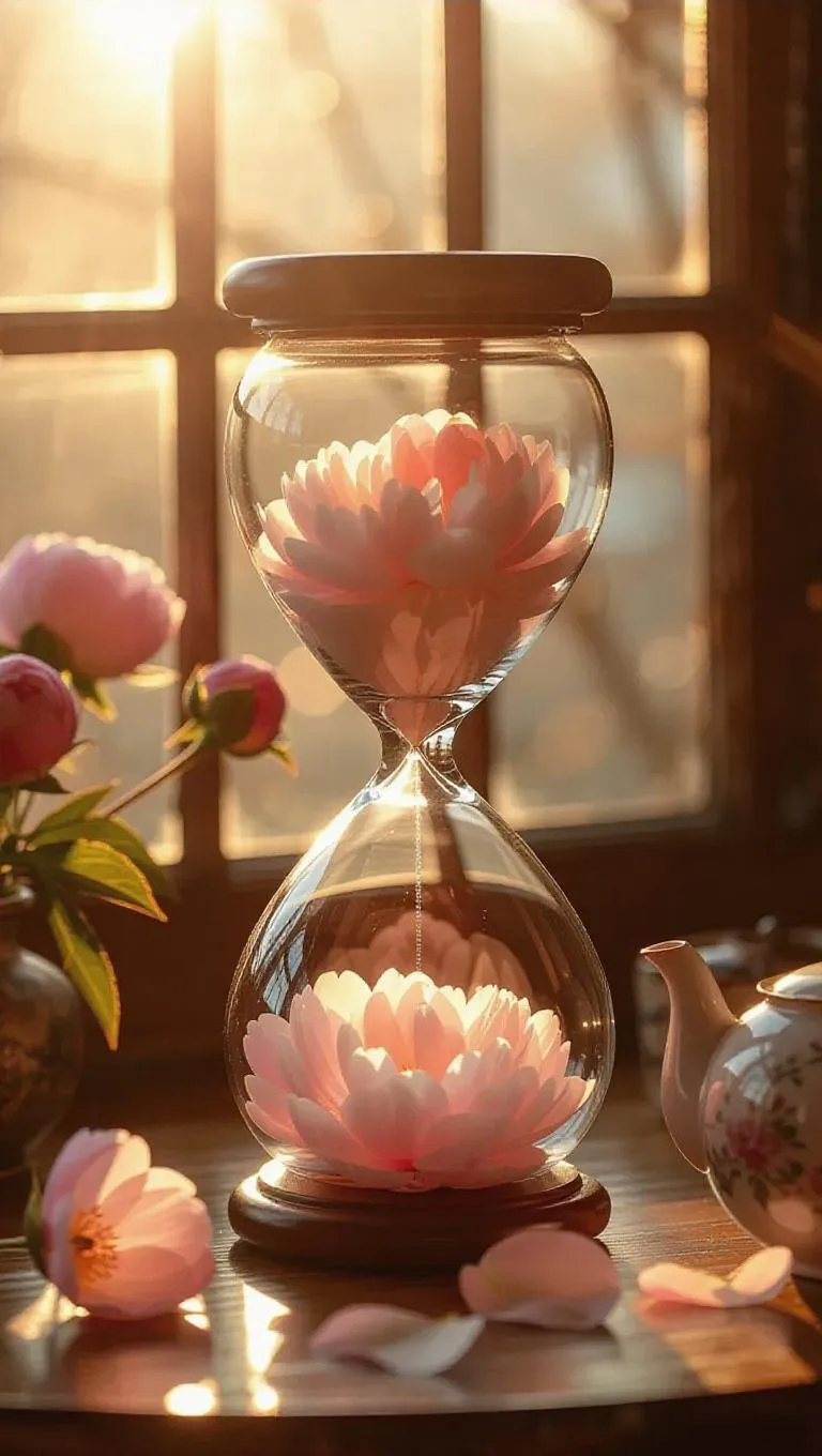A traditional hourglass, its glass clear but heavy, with fragrant peony petals swirling outwards, time merging in a peaceful embrace, surrounded by a soft, golden light, capturing the moment of comforting beauty and nostalgia in a cozy tea room.