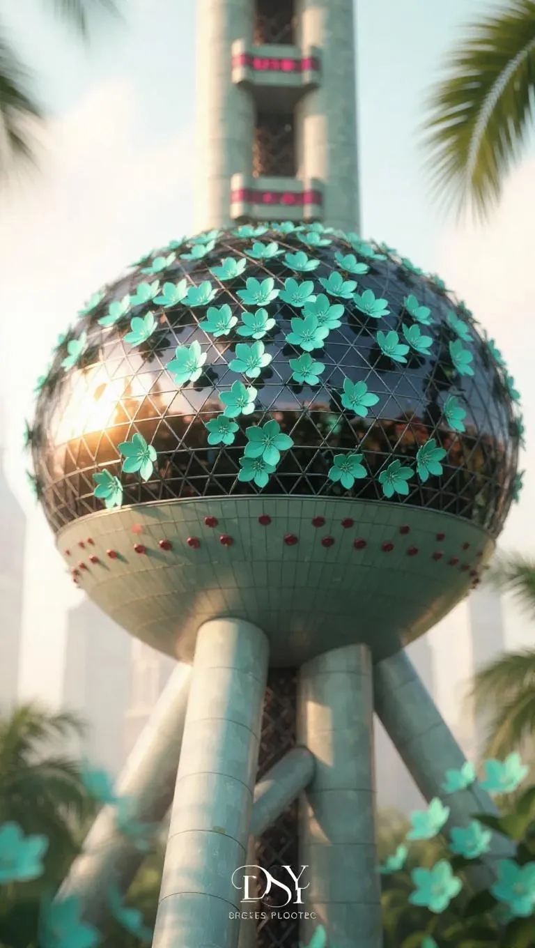 A close-up of the Shanghai Oriental Pearl Tower transformed into a soft, plush, and whimsical version of itself, covered in delicate teal blossoms. The iconic spheres and structure of the tower are rendered in a fluffy, tactile texture, giving it a charming and playful appearance. The tiny teal flowers bloom abundantly across its surface, creating a romantic and dreamy atmosphere. The background is softly blurred, with hints of palm trees and gentle sunlight enhancing the warmth and serenity of the scene. The overall composition exudes a sense of fantasy and enchantment, blending the modern landmark with the softness of nature. The art style is highly detailed and imaginative, emphasizing the fluffy texture of the tower and the delicate beauty of the flowers.