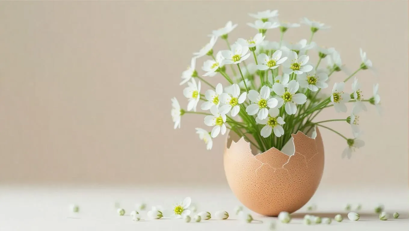 A cracked eggshell, not revealing a chick, but a vibrant cluster of delicate flowers and lush green stems, bursting with life and color, set against a serene, neutral background