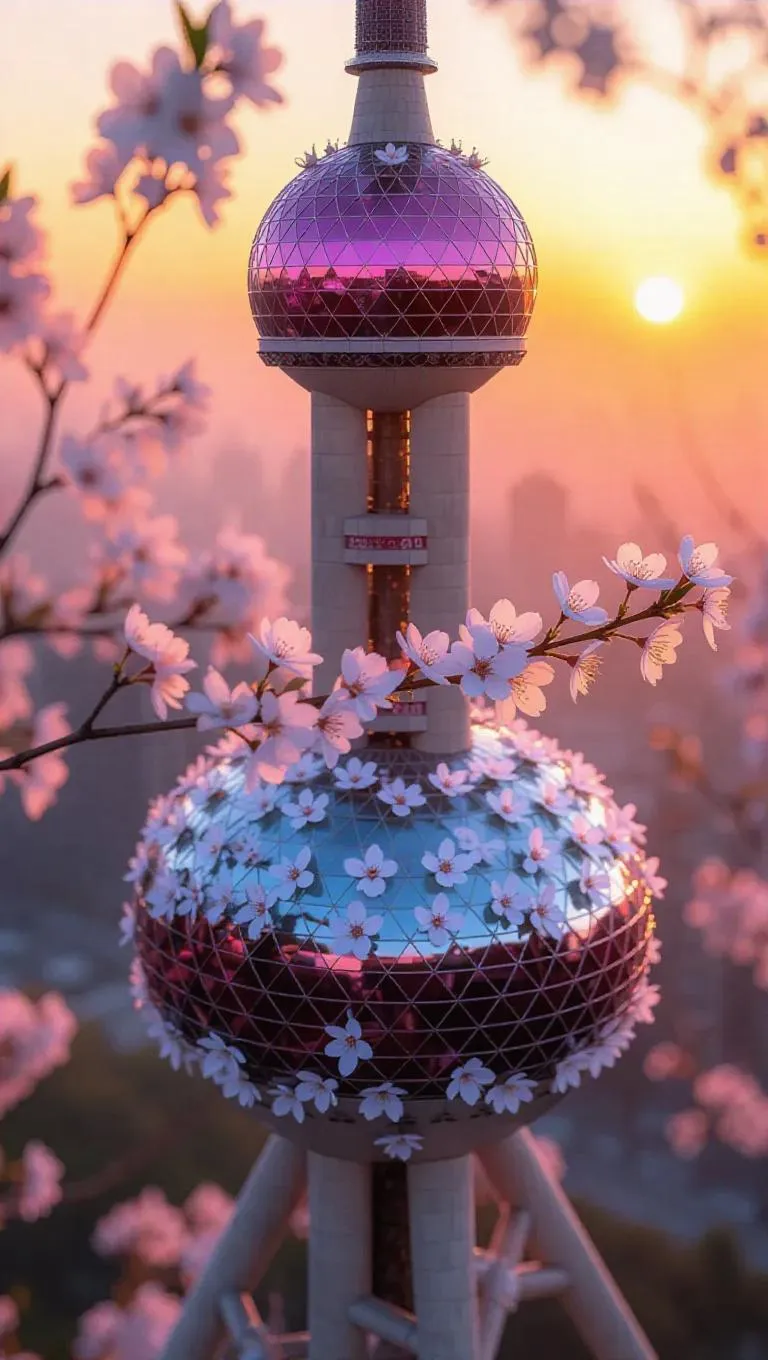 A close-up of the Shanghai Oriental Pearl Tower transformed into a soft, plush, and whimsical version of itself, covered in delicate white blossoms. The iconic spheres and structure of the tower are rendered in a fluffy, tactile texture, giving it a charming and playful appearance. The tiny white flowers bloom abundantly across its surface, creating a romantic and dreamy atmosphere. The background is softly blurred, with hints of a vibrant orange sunset and gentle sunlight enhancing the warmth and serenity of the scene. The overall composition exudes a sense of fantasy and enchantment, blending the modern landmark with the softness of nature. The art style is highly detailed and imaginative, emphasizing the fluffy texture of the tower and the delicate beauty of the flowers.