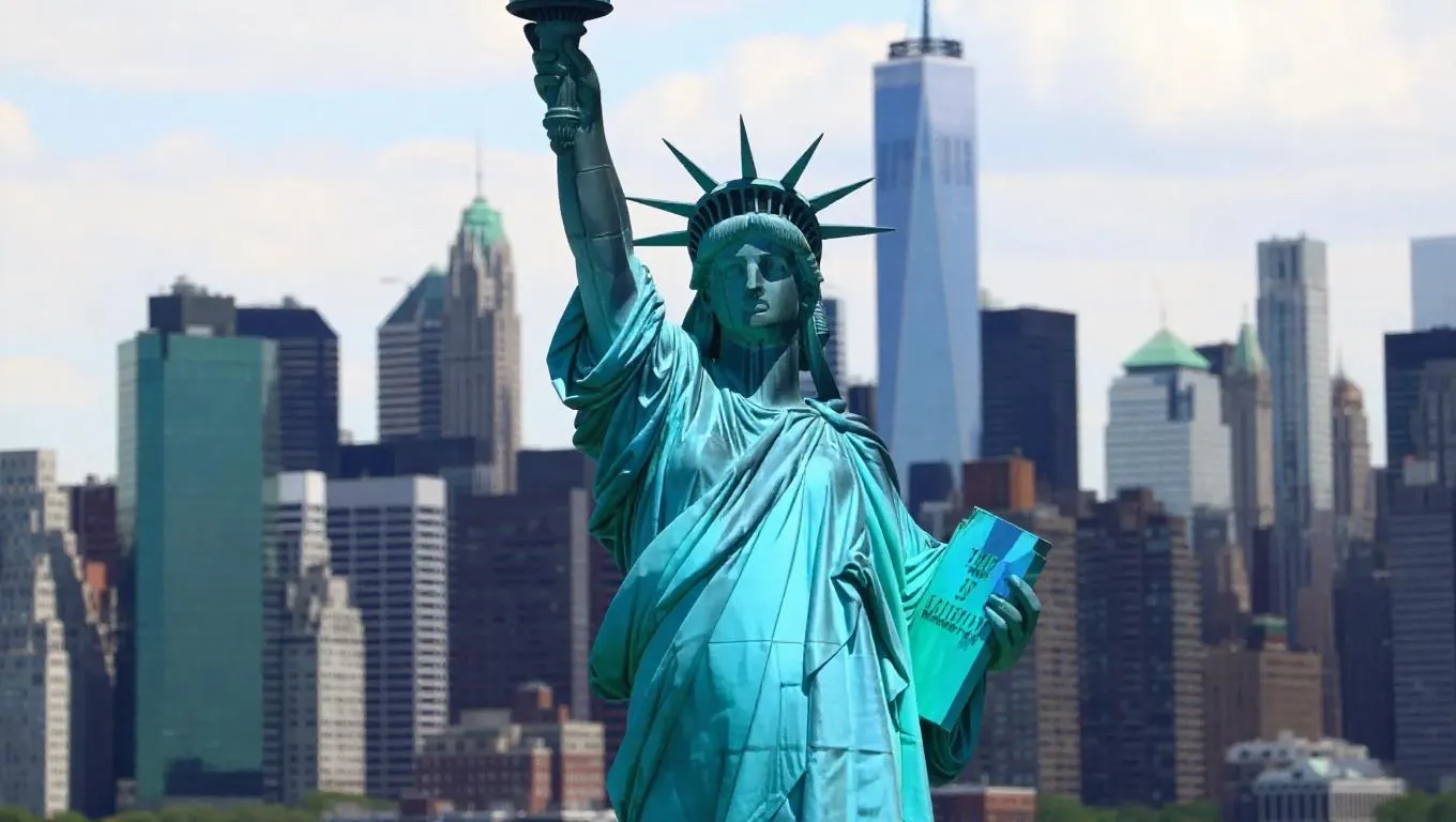 The Statue of Liberty, wearing a chic modern jacket, stands majestically against a contemporary cityscape filled with skyscrapers, symbolizing progress and innovation
