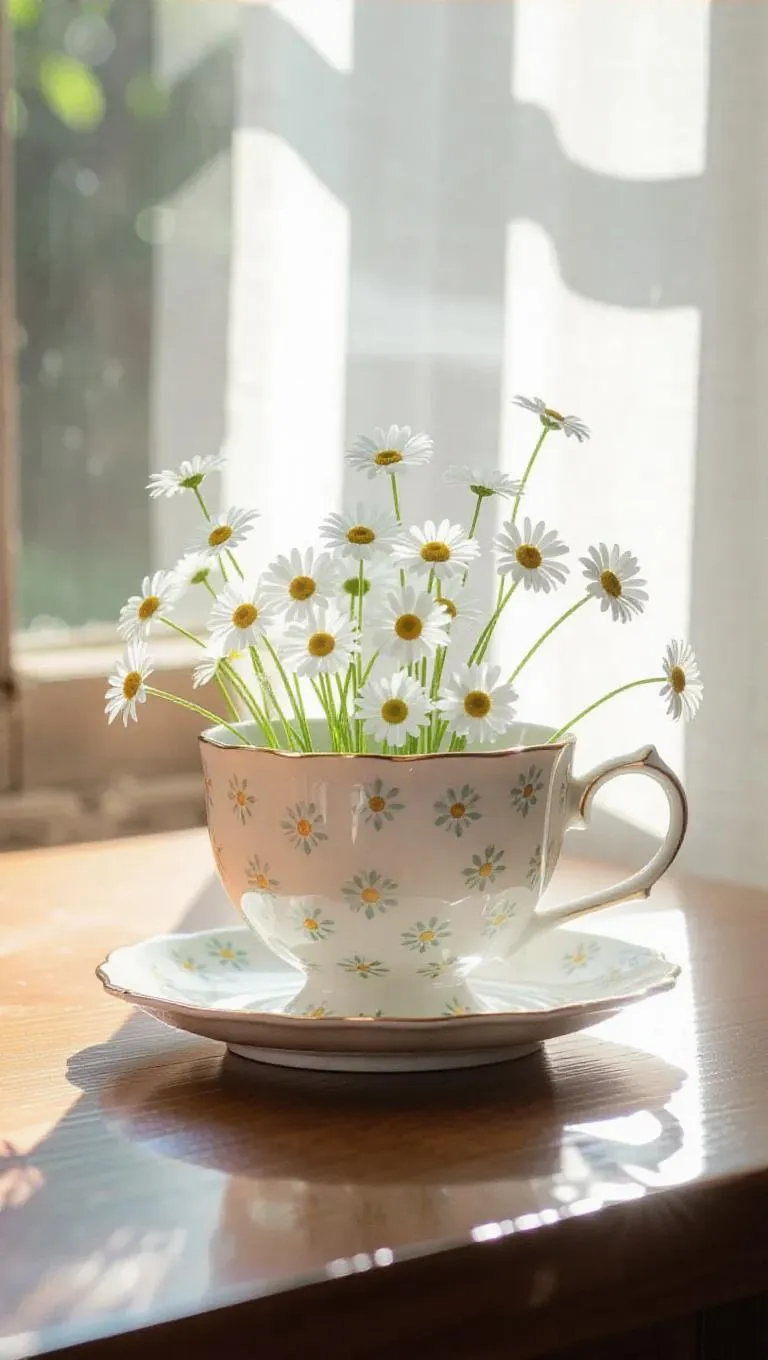 A cracked porcelain teacup adorned with tiny daisies sprouting from its rim and handle, gently resting on a polished oak table by the window, bathed in bright, silver sunlight filtering through sheer curtains