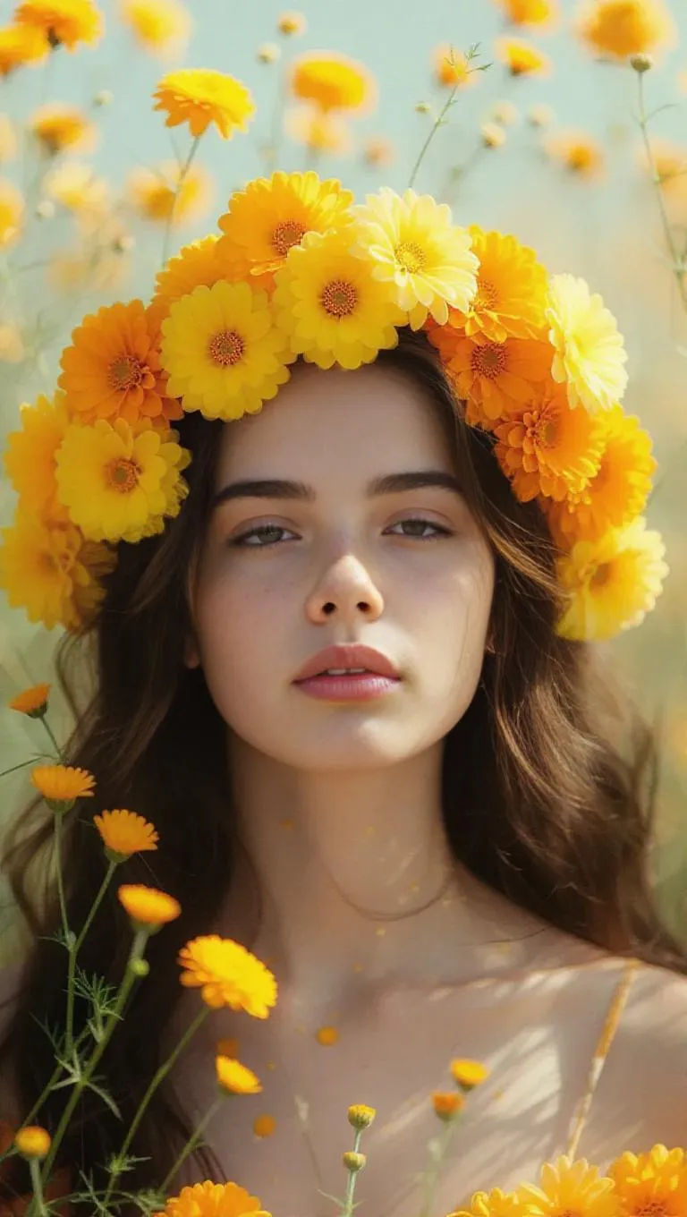 A serene portrait of a woman crafted from vibrant petals, enveloped in a radiant halo of yellow and soft marigolds, set against a dreamy, muted backdrop with ethereal light, enhancing the mystical and enchanting