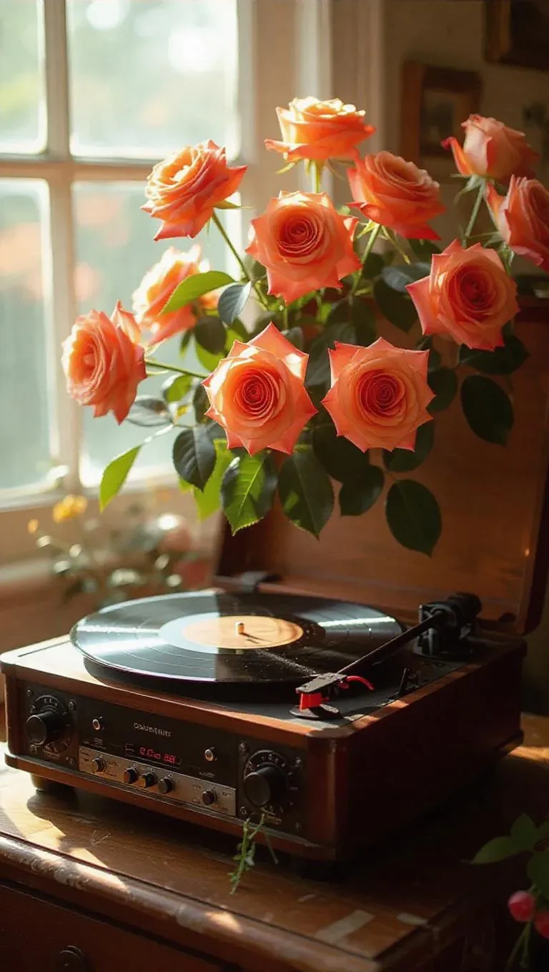 An antique vinyl record player adorned with bold roses sprouting from its speakers, playing peaceful music in a sunlit room, casting a radiant, serene glow