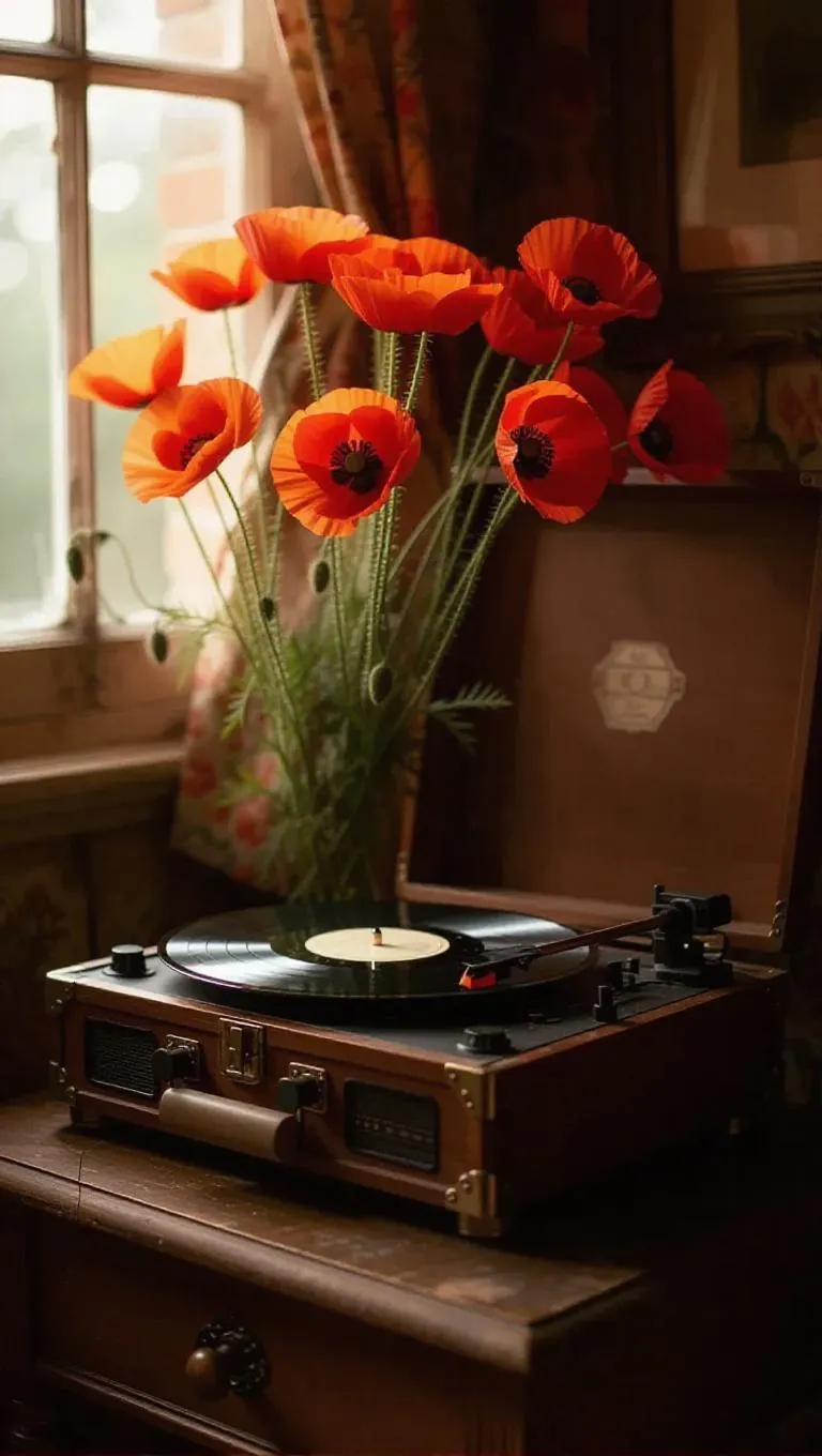 An antique vinyl record player adorned with bright poppies sprouting from its speakers, playing soft music in a dimly lit room, casting an enchanting, magical glow