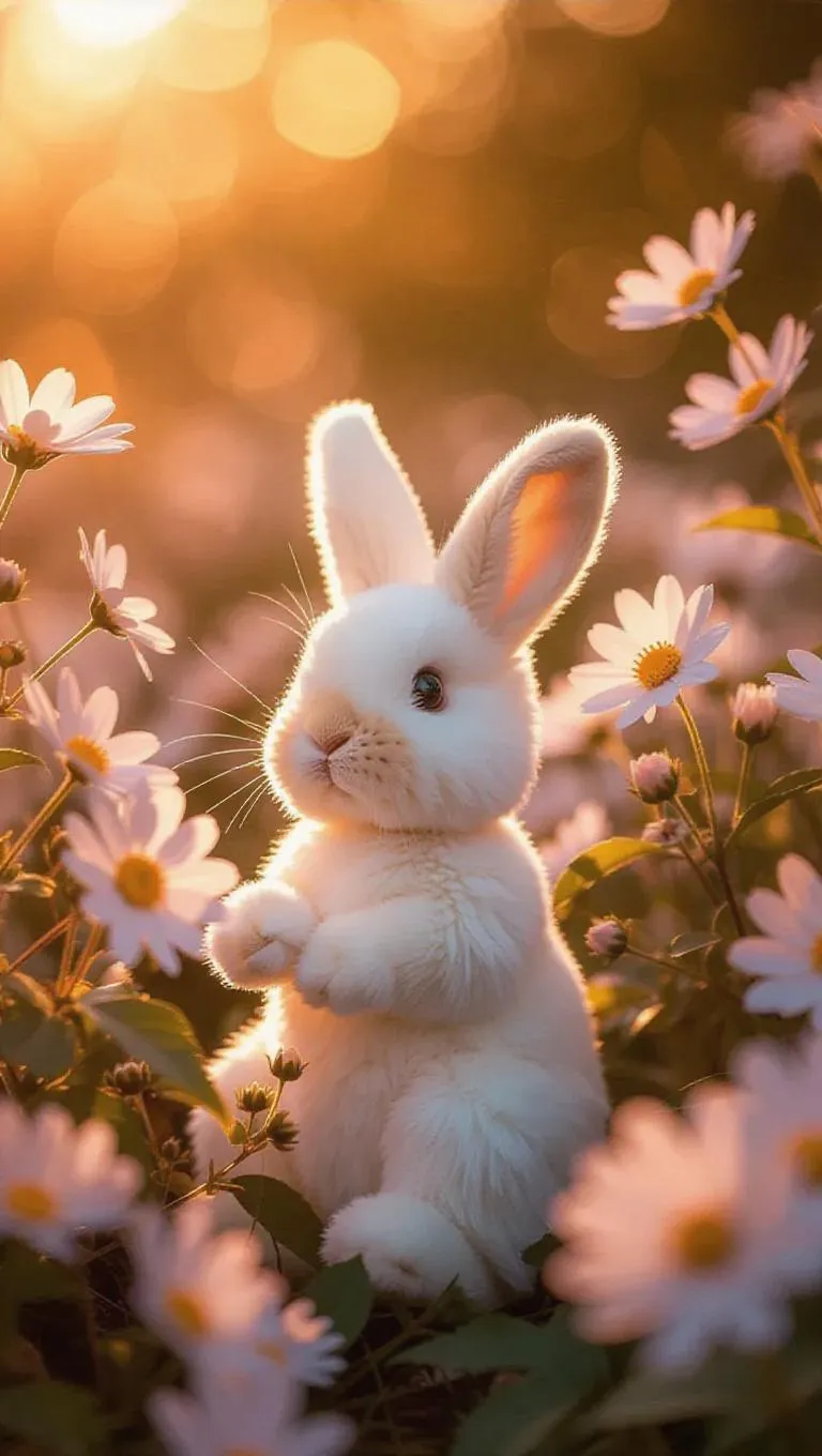 sun-kissed flowers blossom around a fully detailed plush bunny, creating a whimsical and enchanting scene. Soft petals surround the bunny, adding a touch of magic and fairy tale charm.