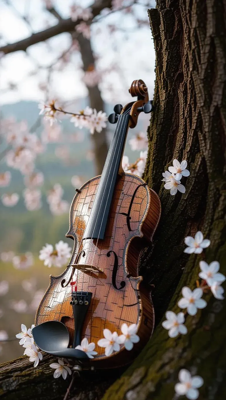 A weathered violin lying beside an ancient tree, its wooden body cracked open, with delicate cherry blossoms sprouting from within, petals gently fluttering in the breeze, creating a surreal and enchanting scene