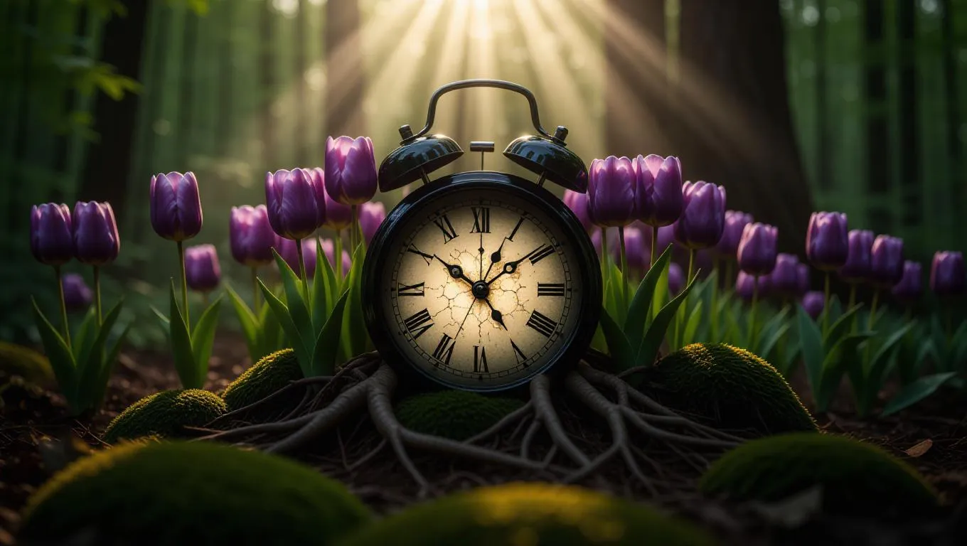 A cracked clock nestled deep in the forest, its glow radiant and soft, flourishing with purple tulips, surrounded by mossy roots and shafts of sunlight reflecting through the leaves.
