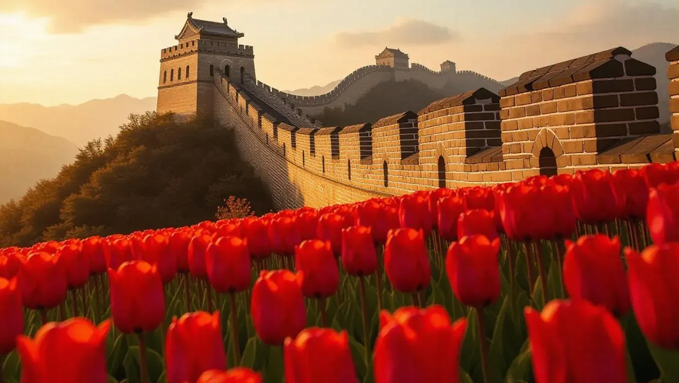 An artistic close-up of the Great Wall of China, its ancient stones transformed into a colorful mixture of fiery red tulips. The iconic wall shape remains, but the summit is now a picturesque, floral escape. Golden sunlight gently illuminates the petals, casting a warm, passionate glow. The atmosphere is serene and vibrant, with light clouds enhancing the tranquil, symbolic blend of nature and emotion.