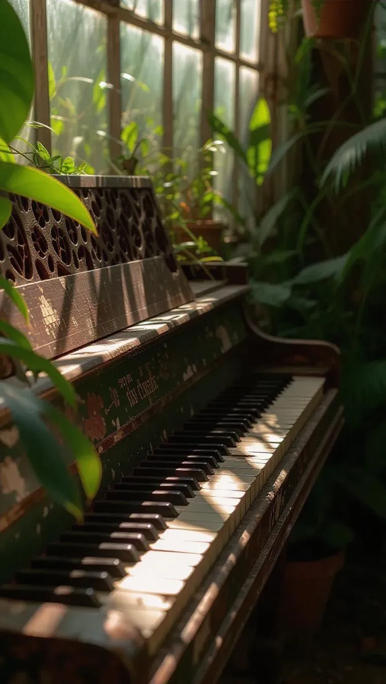 A weathered piano in a bright greenhouse, keys missing and mingling with exotic plants, creating a surreal blend of decay and renewal, with sunlight pouring through glass panes, casting colorful patterns on the ivories and leaves