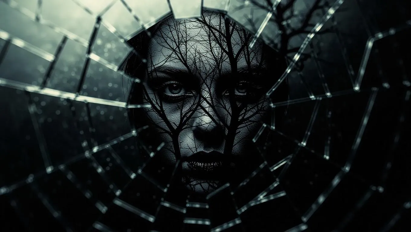 A shattered mirror reflecting a dark, twisted tree where a face should be, symbolizing inner turmoil and decay. The mirror's fragmented pieces create a mosaic effect, with each shard revealing different angles of the eerie tree, surrounded by a sharp, menacing glow.