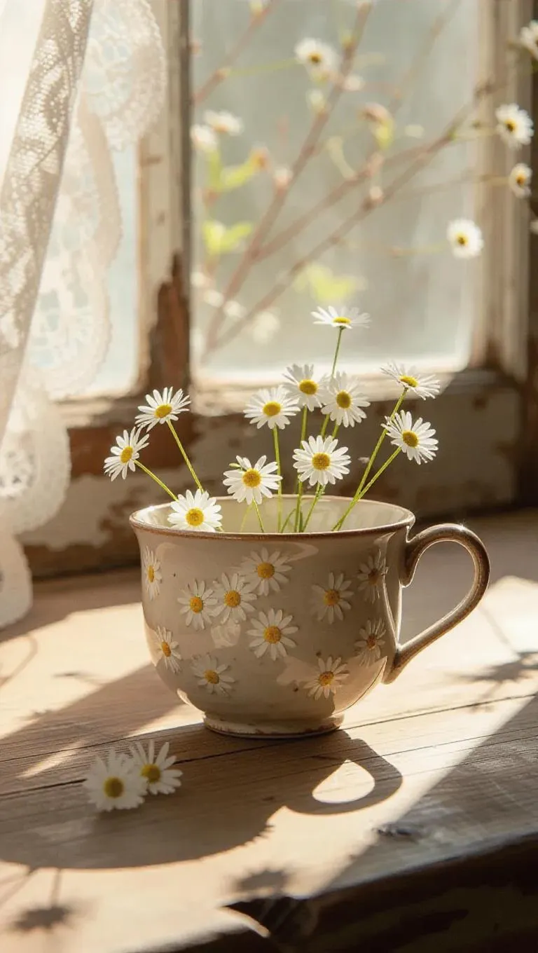 A handmade earthenware teacup adorned with petite daisies dancing from its rim and handle, resting elegantly on a distressed wooden table by the window, warmed by soft, golden rays filtering through lace curtains