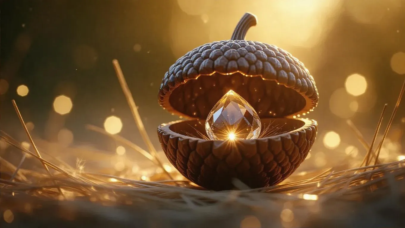 A cracked acorn cap, harboring a sparkling crystal instead of a chick, surrounded by soft wisps of light, against a serene, calming atmosphere.