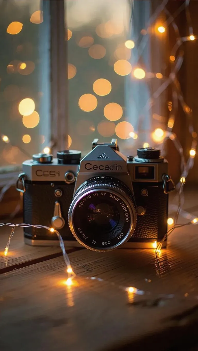 An antique camera with whimsical, twinkling lights strung around the lens and shutter buttons, creating a whimsical blend of vintage charm and festive ambiance. The camera rests on a rustic wooden surface, surrounded by soft, diffused sunlight filtering through windows, enhancing the serene and magical atmosphere.