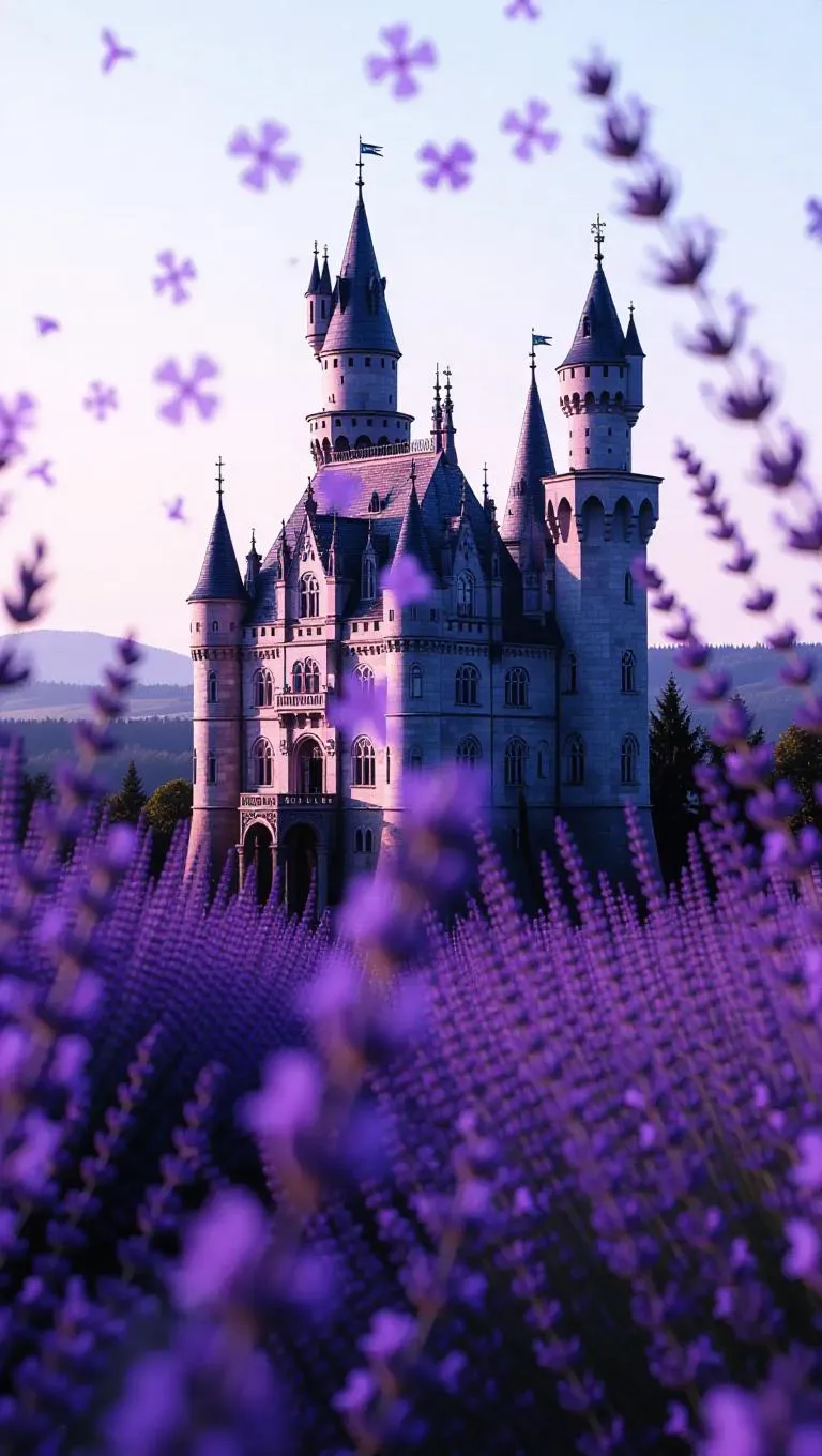 An antique castle, its glass shattered, with delicate lavender petals floating out, time frozen in eternal bloom, surrounded by a soft, ethereal glow, capturing the moment of timeless beauty and fragility in a fragrant lavender garden.