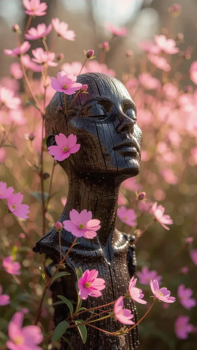 A melted wooden figurine in a garden with pink flowers emerging from the cooled surface, symbolizing rebirth and renewal, the delicate petals contrasting with the hardened wood, creating a serene and poetic scene of life after destruction.