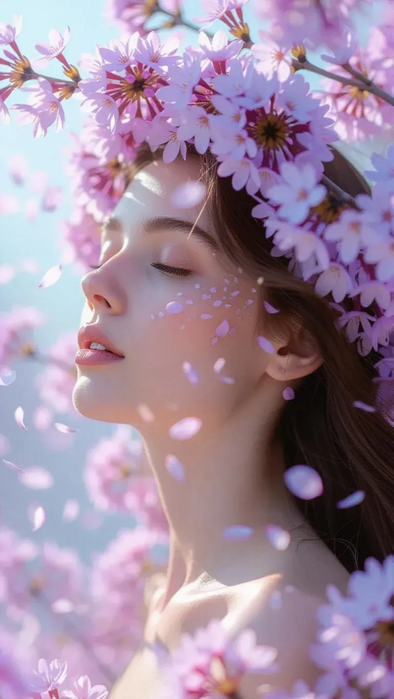 A serene portrait of a woman crafted from delicate petals, enveloped in a radiant halo of lavender and soft cherry blossoms, set against a dreamy, pastel backdrop with ethereal light, enhancing the mystical and enchanting