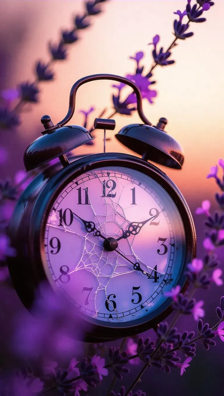 An antique clock, its glass slightly cracked, with vibrant buds emerging, time fading in eternal memory, surrounded by a soft, lavender glow, capturing the moment of tender beauty and fragility