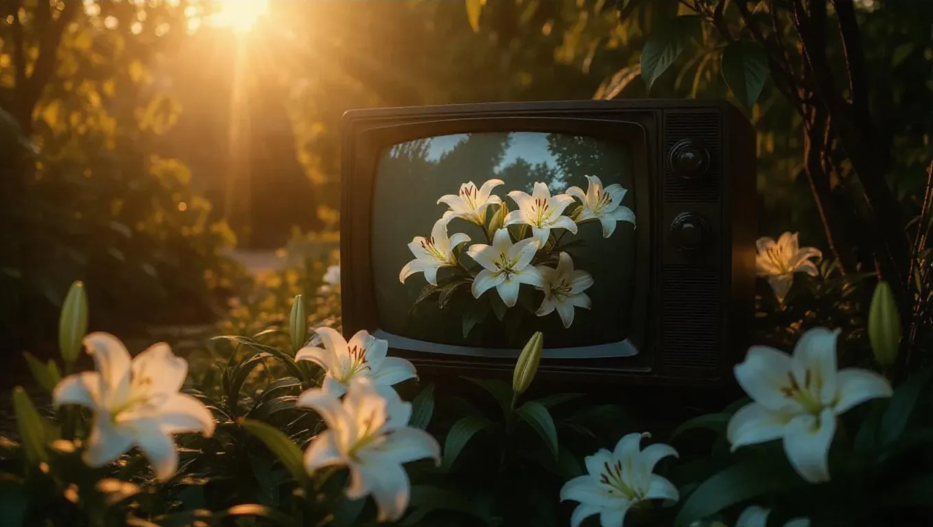 A broken television set nestled in a lush garden, its screen glowing faintly, blooming with intricate white lilies, surrounded by winding paths and a soft golden hour glow