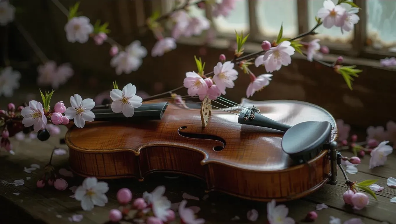 A weathered violin lying in a dimly lit room, its wooden body cracked open, with delicate cherry blossoms sprouting from within, petals gently fluttering in the breeze, creating a surreal and enchanting scene