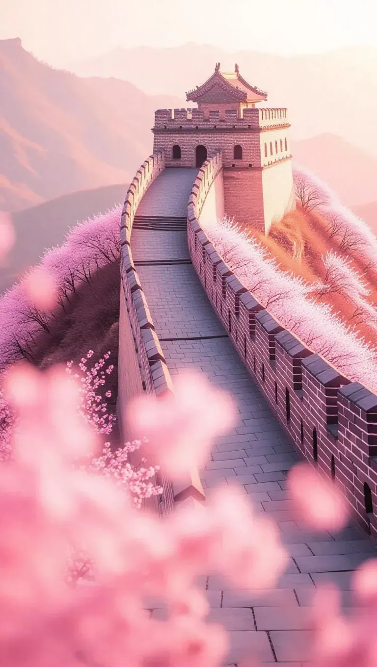 An artistic close-up of the Great Wall of China, its ancient stones transformed into a delicate sea of pale pink blossoms. The iconic wall shape remains, but the summit is now a soft, floral haven. Golden spring sunlight gently illuminates the petals, casting a warm, dreamy glow. The atmosphere is serene and ethereal, with pastel clouds enhancing the tranquil, symbolic blend of nature and rebirth.