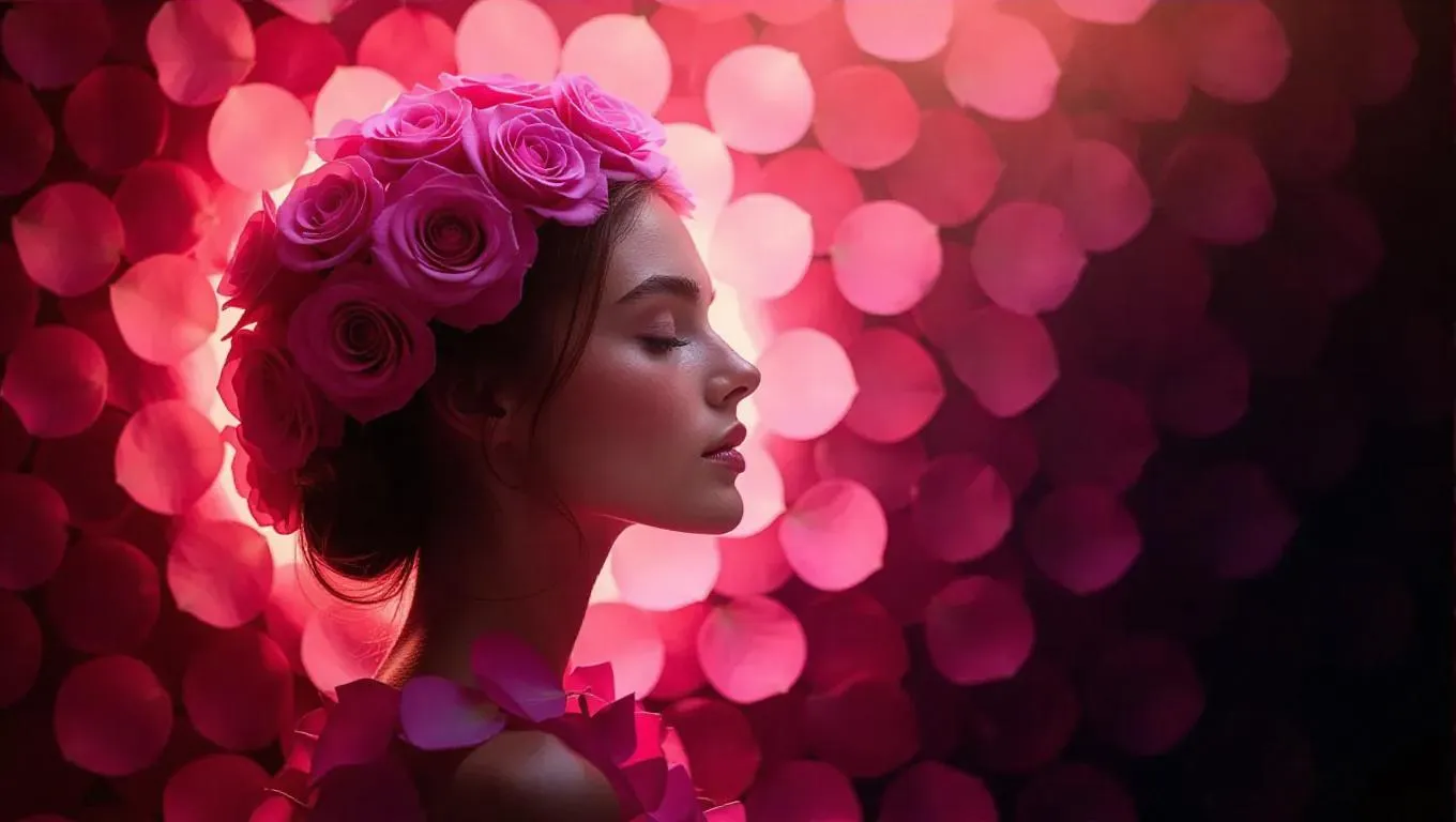 A serene portrait of a woman crafted from delicate petals, enveloped in a radiant halo of pink and soft roses, set against a dreamy, dark backdrop with ethereal light, enhancing the mystical and enchanting