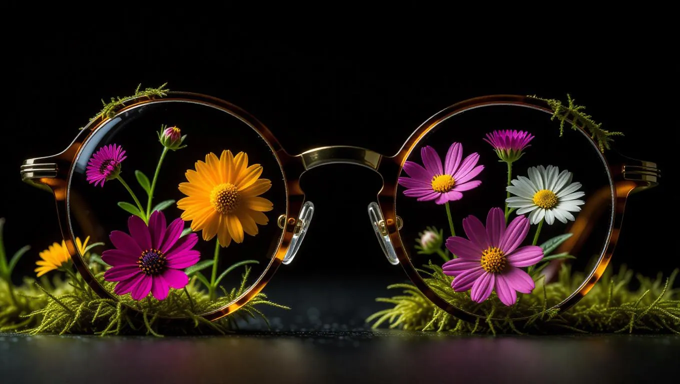 A cracked pair of reading glasses, the fissures filled with luscious blooming flowers and moss