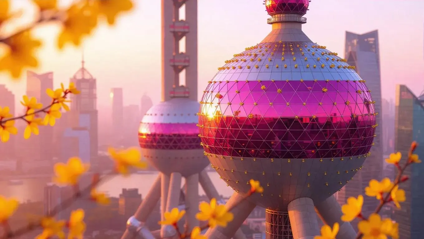 A close-up of the Shanghai Oriental Pearl Tower transformed into a soft, plush, and whimsical version of itself, covered in delicate yellow blossoms. The iconic spheres and structure of the tower are rendered in a fluffy, tactile texture, giving it a charming and playful appearance. The tiny yellow flowers bloom abundantly across its surface, creating a romantic and dreamy atmosphere. The background is softly blurred, with hints of a clear pink sky during dawn and gentle sunlight enhancing the warmth and serenity of the scene. The overall composition exudes a sense of fantasy and enchantment, blending the modern landmark with the softness of nature. The art style is highly detailed and imaginative, emphasizing the fluffy texture of the tower and the delicate beauty of the flowers.