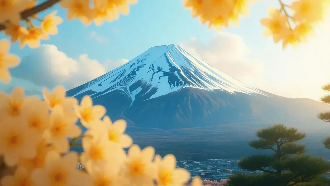 An artistic close-up of Mount Fuji, its snow-capped peak turned into a blossoming expanse of creamy yellow flowers. The iconic mountain shape remains, but the summit is now a cheerful, floral haven. Sunlight streams down, highlighting the petals with a warm, inviting glow. The atmosphere is friendly and cosy, with puffy clouds enhancing the gentle, symbolic blend of nature and comfort.