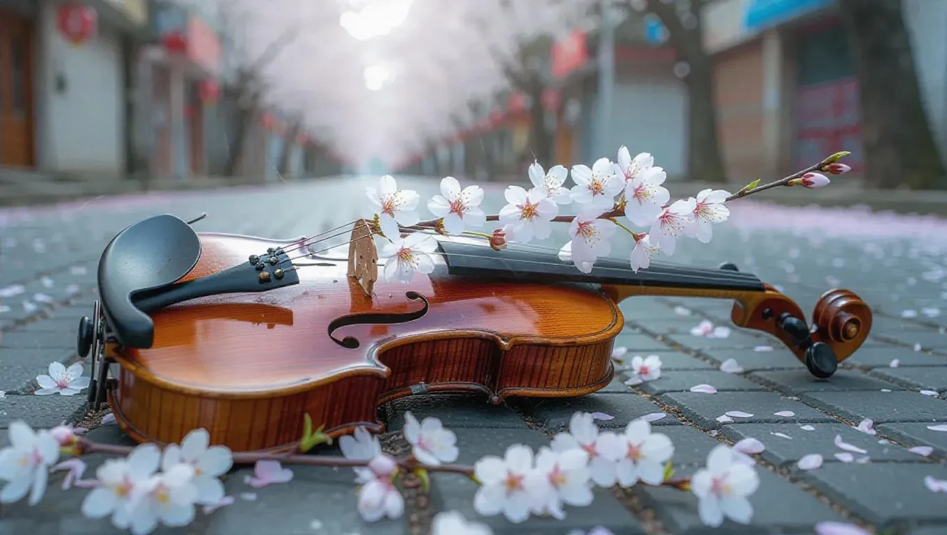 A weathered violin lying in an abandoned city street, its wooden body cracked open, with delicate cherry blossoms sprouting from within, petals gently fluttering in the breeze, creating a surreal and enchanting scene