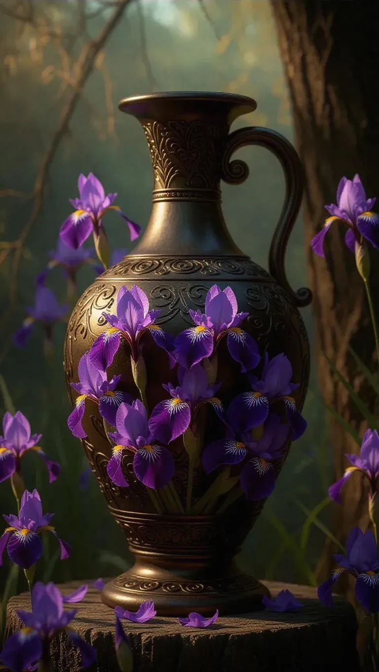 A historical amphora, its design ornate, with purple iris petals unfurling, time suspended in an idyllic spring, enveloped by a soft, gentle light, portraying the beauty of delicate fragility and timeless allure in an enchanted woodland.