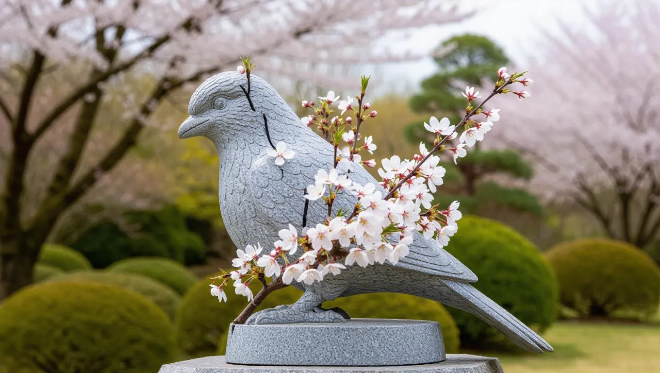 A stone statue of a bird, cracks along its tail opening into clusters of cherry blossoms