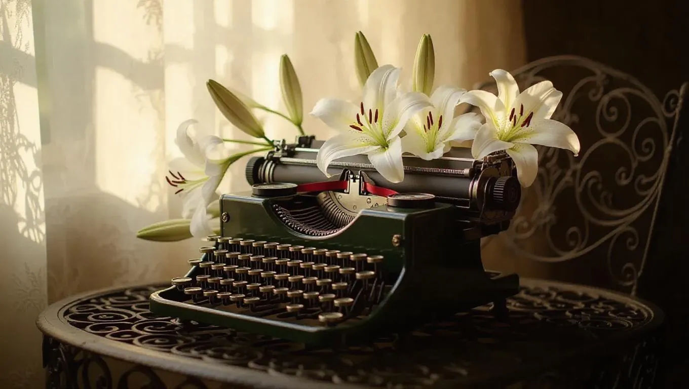 An antique typewriter with elegant, blooming lilies sprouting from the keys and carriage, creating a whimsical blend of vintage charm and natural beauty. The typewriter rests on a dark wrought iron table, surrounded by soft, warm sunlight streaming through curtains, enhancing the serene and magical atmosphere.