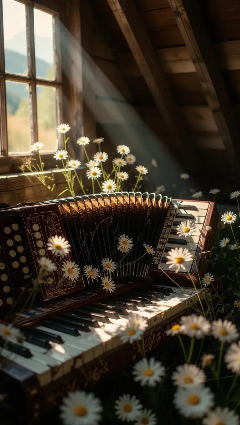 A weathered accordion in a remote mountain cabin, keys missing and enveloped by wildflowers, creating a surreal blend of decay and renewal, with sunlight pouring through the roof beams, casting rustic shapes on the ivories and blooms.