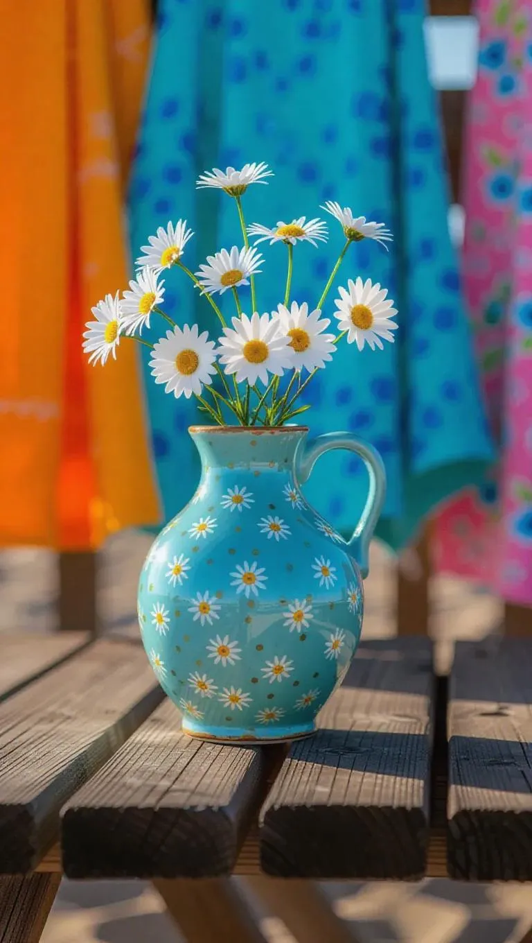 A cracked porcelain vase adorned with tiny daisies sprouting from its rim and handle, gently resting on a weathered wooden table by the beach, framed by vibrant beach towels in the background.