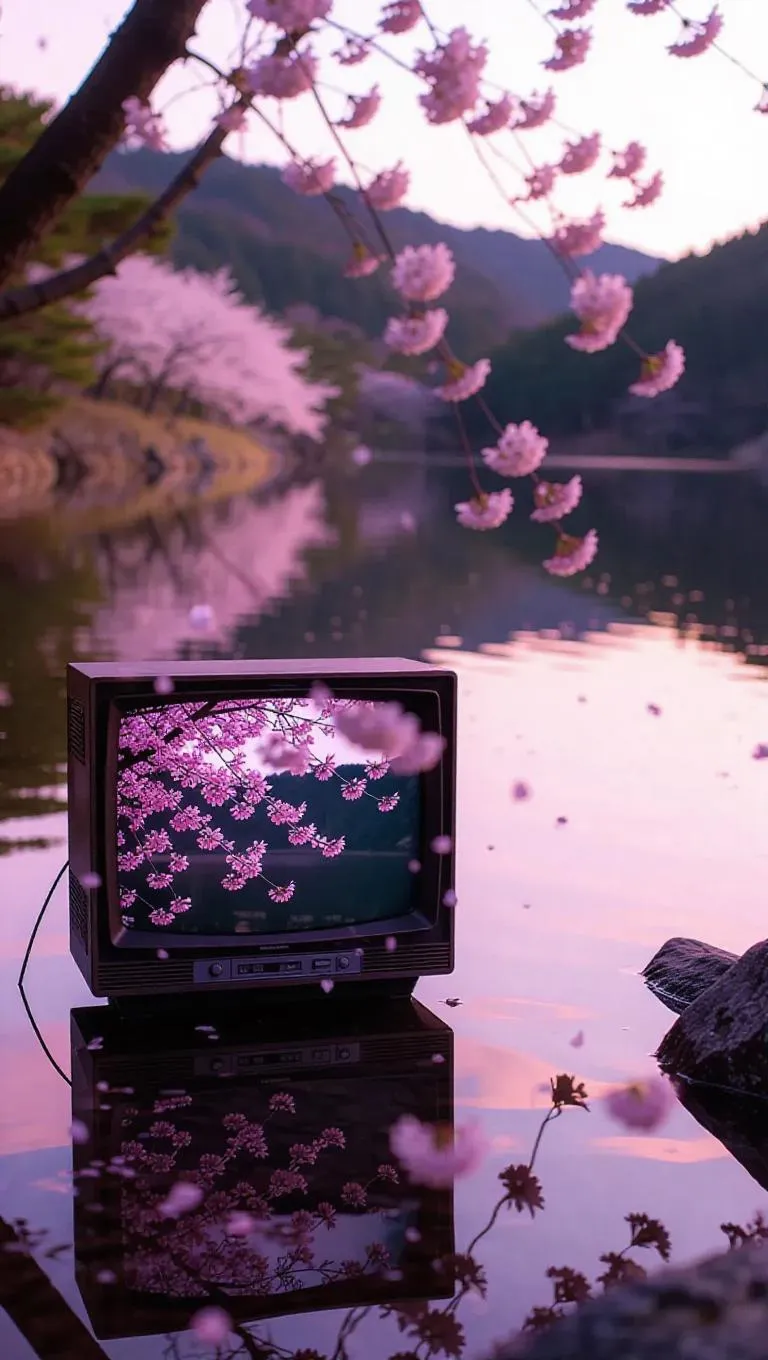 A broken television set nestled by a tranquil lake, its screen glowing faintly, blooming with soft pink cherry blossoms, surrounded by rippling water and gentle breezes