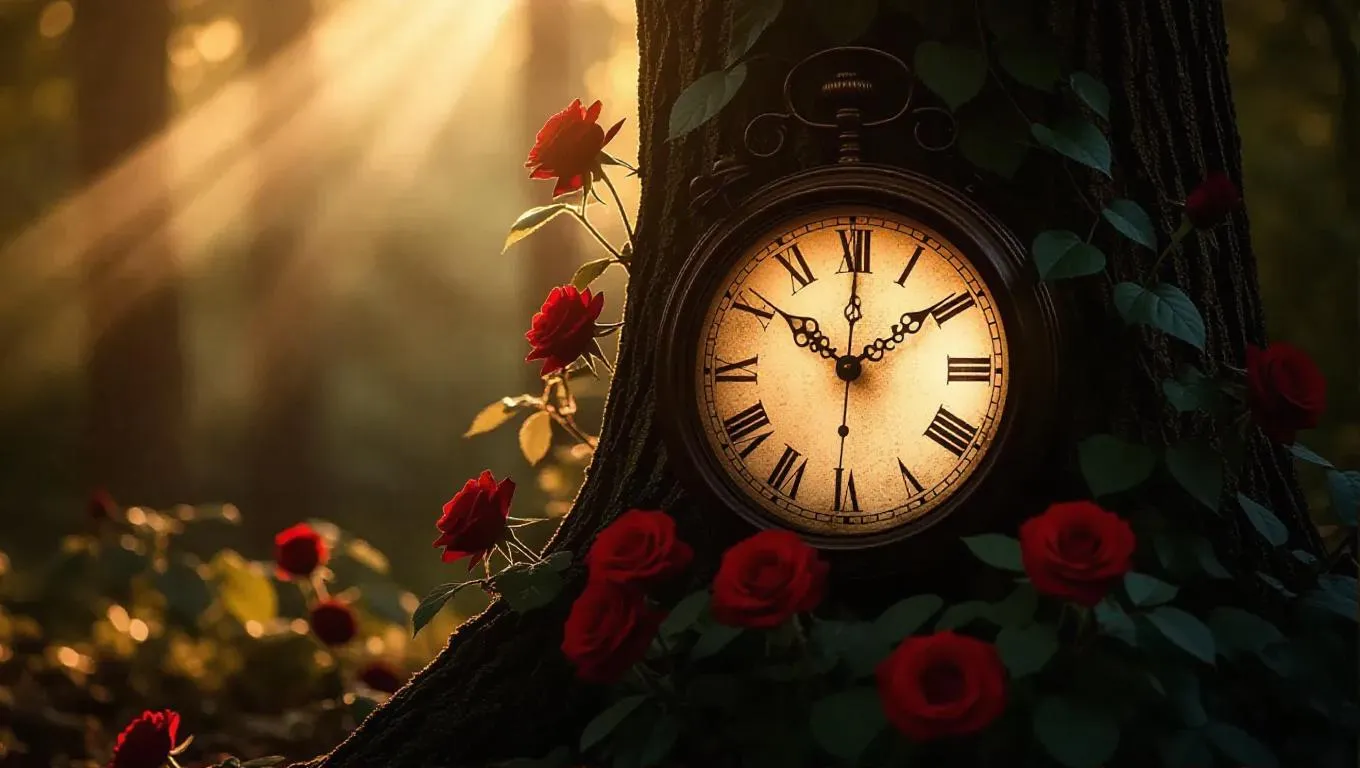 A weathered clock resting in the thick underbrush, its numbers glowing eerily, blossoming with red roses, surrounded by tree trunks draped in ivy and warm beams of sunlight spilling through the branches.