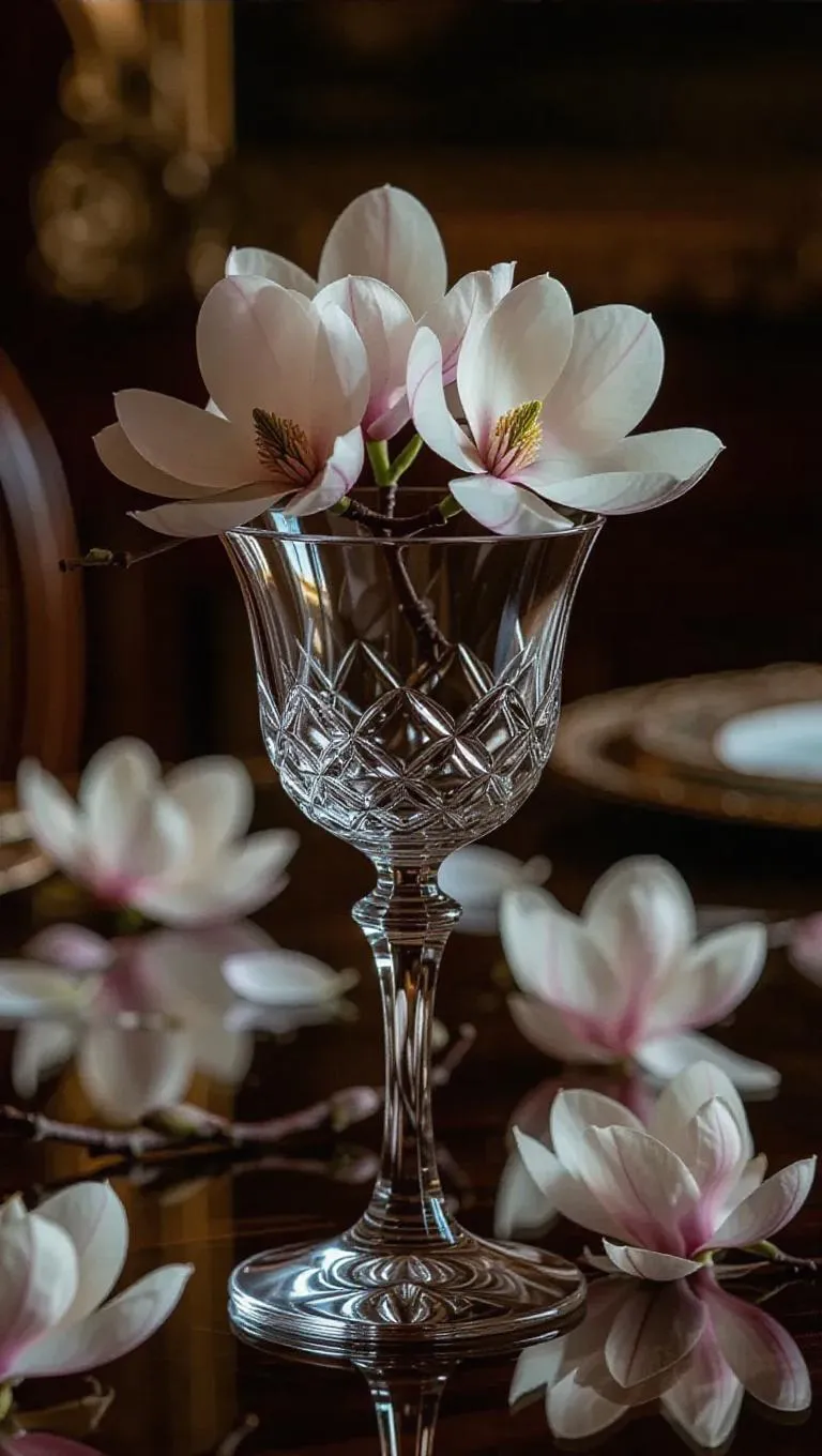 An antique goblet, its form classic, with delicate magnolia petals scattered, time frozen in a luxurious banquet, surrounded by a soft, reflective sheen, revealing the essence of beauty and indulgence in a historical manor.