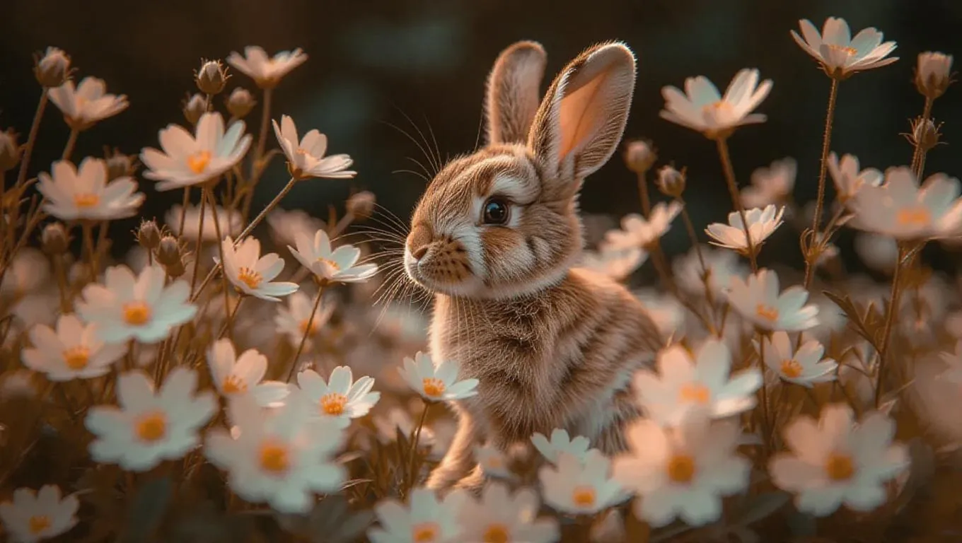 delicate wildflowers bloom around a fully detailed plush bunny, creating a whimsical and enchanting scene. Soft petals surround the bunny, adding a touch of magic and fairy tale charm.